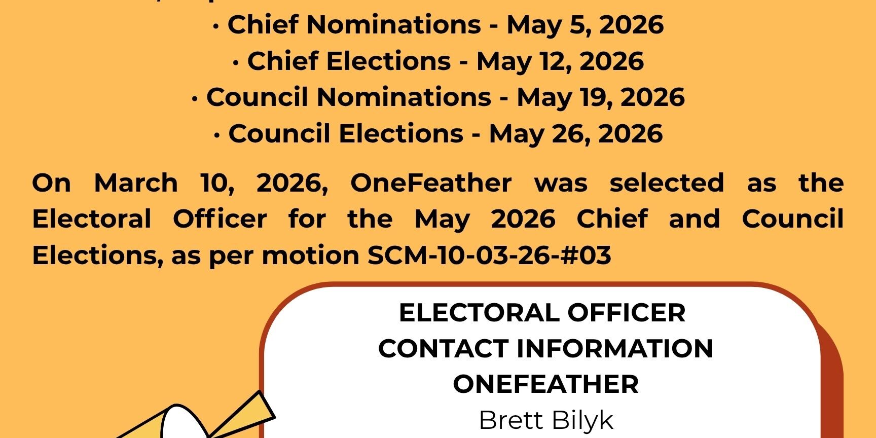 Categories: 2026, Administration, Chief and Council, Elections, News, NoticeApril 22, 2026Tags: #SamsonCreeNAtionElections #SCNChiefandCouncilElectionsSCNelections Share this post Share on XShare on X Pin itShare on Pinterest Share on FacebookShare on Facebook Share on LinkedInShare on LinkedIn Post navigationPreviousPrevious post:Now Hiring! Community Wellness Manager – May 1, 2026Related postsNow Hiring! Community Wellness Manager – May 1, 2026April 20, 2026Atoskewin Labourer – Samson Public Works – Atoskewin Program.April 20, 2026Spring Cleaning Workshop – Pathways to Healthy LifestylesApril 20, 2026Cultural Baskets Program – Integrated Family Services.April 20, 2026Nipisihkopahk Acimowin Newsletter – April 1st, 2026April 6, 2026NOTICE: Easter Holiday Office Closure – April 3 & 6, 2026April 2, 2026