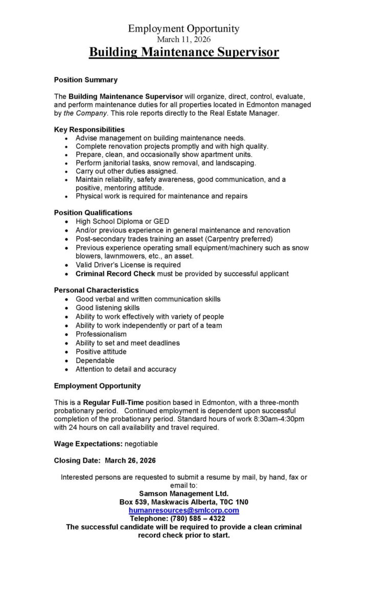Current Employment Opportunities with SCN as of March 2, 2026! Looking to build your career and serve your community? We are hiring! Apply now through the SCN Personnel Department – don’t miss your chance! Submit your resume today! Apply with SCN Personnel in person or email personnel.179@gmail.com / kyle.s@samsoncree.com or call 780-585-3793 ext 107.…