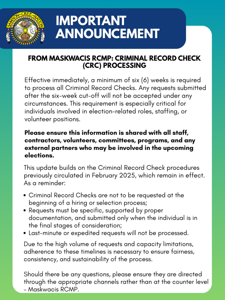 Notice from Maskwacis RCMP: Criminal Record Check Processing