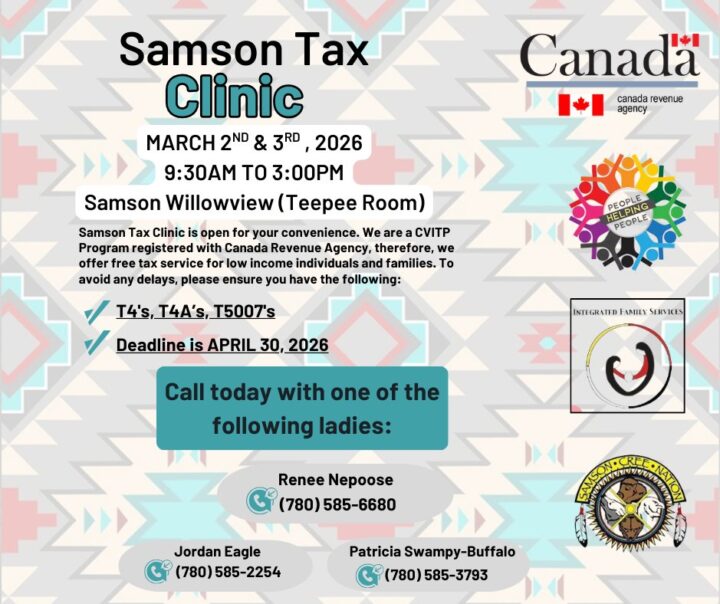 The Samson Tax Clinic is open to everyone and here to help. If you’re a low-income individual or family, you may qualify for FREE tax filing services through our CVITP program registered with the Canada Revenue Agency. March 2 & 3, 2026 9:30 AM – 3:00 PM Samson Willowview (Teepee Room) Avoid delays —…