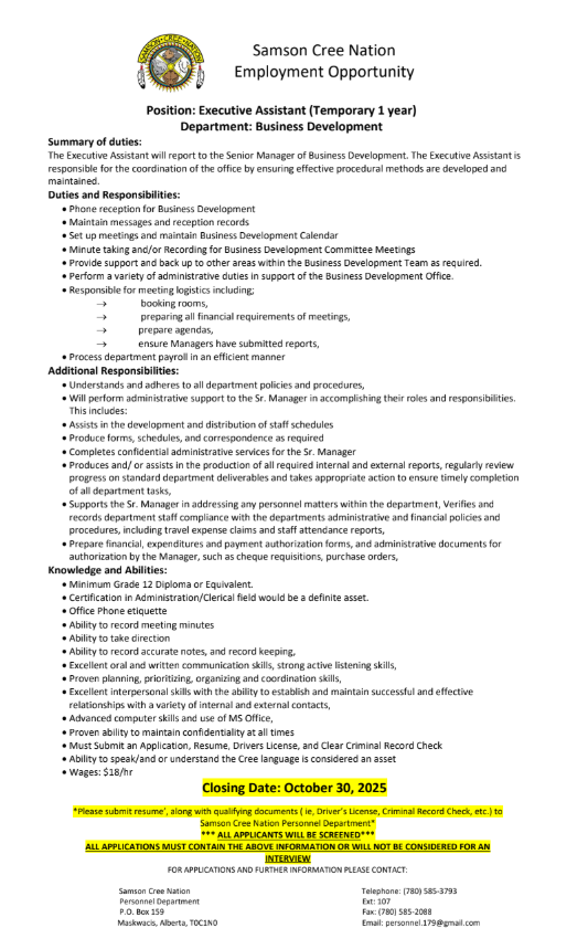 Maskwacis, Alberta, T0C1N0 Email: personnel.179@gmail.com